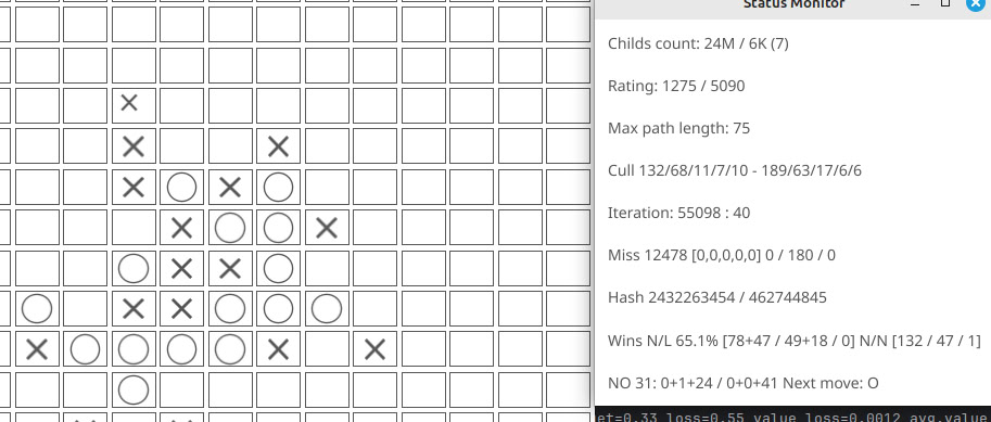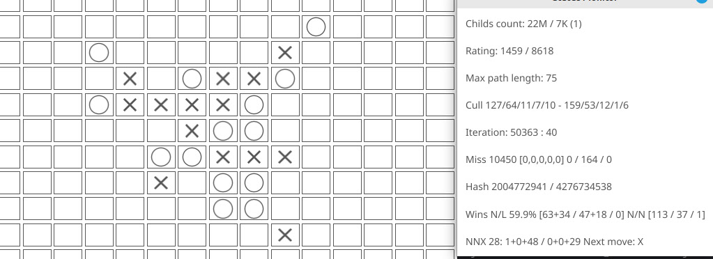 Итак, 9 апреля 2026 года началась тренировка новой сети гомоку. Одна сессия тренировок наращивает легаси дерево вариантов примерно до 40 миллионов ходов, проводя примерно 10 тысяч тренировок нейронной сети. Каждая тренировка передаёт в нейронку определённую позицию, а также оценку позиции (для value head) и лучшие ходы (для policy head).