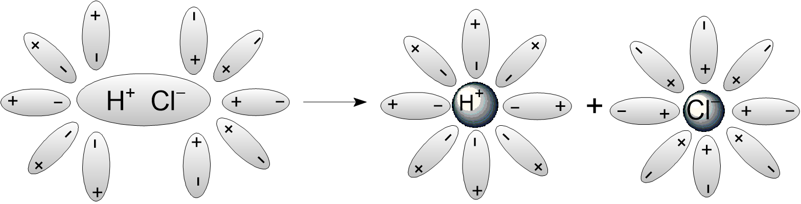 При растворении HCl в воде молекулы воды окружают молекулы хлороводорода и изменяют характер связи в молекуле. Сначала связь становится более полярной, а затем переходит в ионную связь как результат диссоциации электролита в воде: