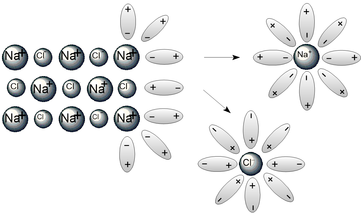 Молекулы воды являются полярными, т.е. на атоме кислорода сосредоточен частичный отрицательный заряд, а на атомах водорода частичный положительный заряд. Поэтому схематично эти молекулы изображают в виде овала с зарядами + и − на двух концах. Ионы в водном растворе находятся не в свободном состоянии, а связаны с молекулами воды, т.е. являются гидратированными.