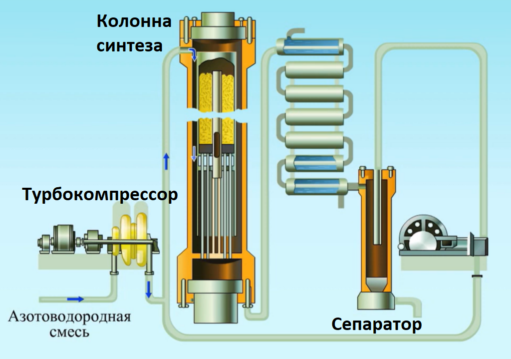 В трубопровод подаётся смесь газов азота и водорода. С помощью компрессора создаётся давление, необходимое для осуществления синтеза аммиака. Смесь газов подаётся в верхнюю часть колонны синтеза, и после прохождения через катализатор газовая смесь, содержащая азот, водород и аммиак, направляется в холодильник, где происходит охлаждение водой. В сепараторе конденсат аммиака отделяется от других газов и поступает на склад.