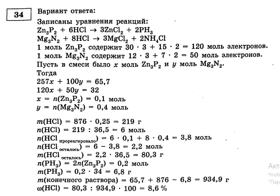 Смешали фосфид цинка и нитрид магния. Полученную смесь общей массой 65,7 г, в которой общее число электронов в 32 раза больше числа Авогадро, растворили в 876 г 25%-ной соляной кислоты. Вычислите массовую долю кислоты в конечном растворе. В ответе запишите уравнения реакций, которые указаны в условии задачи, и приведите все необходимые вычисления (указывайте единицы измерения и обозначения искомых физических величин).