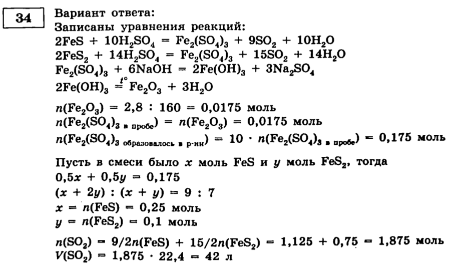 Смесь FeS и FeS, нагрели с избытком концентрированной серной кислоты до полного растворения твёрдых веществ. Одну десятую часть полученного раствора отобрали для проведения анализа. К отобранной пробе добавили избыток раствора гидроксида натрия, полученный осадок промыли и прокалили. Масса образовавшегося твёрдого вещества составила 2,8 г. Найдите объём газа (н. у.), выделившегося при обработке исходной смеси концентрированной серной кислотой, если известно, что отношение числа атомов серы к числу атомов железа в исходной смеси составляло 9 : 7. В ответе запишите уравнения реакций, которые указаны в условии задачи, и приведите все необходимые вычисления (указывайте единицы измерения искомых физических величин),