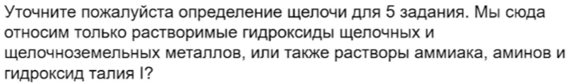 41. Щёлочи - сильные растворимые и малорастворимые основания (для задания 5). Растворы аммиака, аминов и гидроксид таллия I к щелочам не относятся.